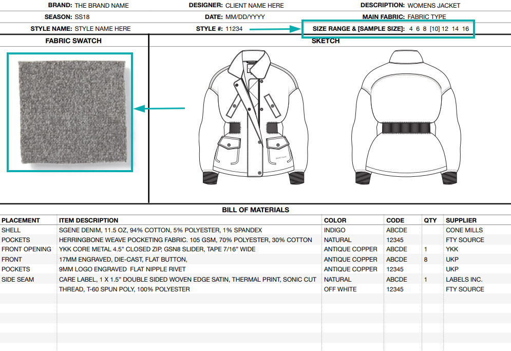 Tech packs is a detailed document containing technical specifications for a product, including:
